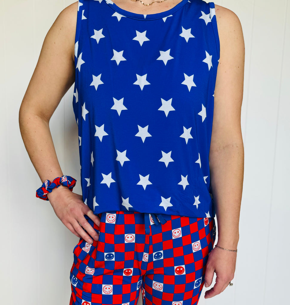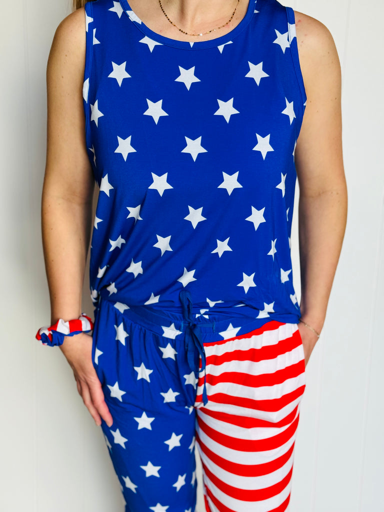 This bamboo tank is perfect to pair with joggers for bedtime or even to pair with jeans/shorts to celebrate Memorial Day, 4th of July etc!